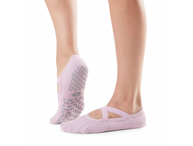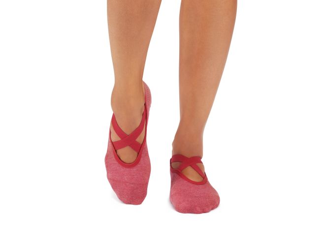 Fall head over heels for Chloe's sweetly criss-cross elastic design. Her low profile hugs just below the ankle while Tavi Noir's stellar grip sock pattern safely moves you through barre, Pilates and yoga classes. Criss-cross elastic detail to keep sock in place.