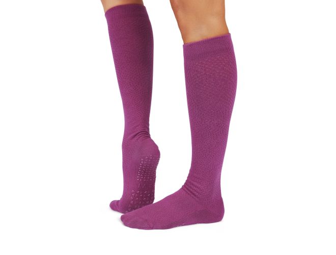 Jane bounds from studio to street with easy style that's soft and simple. Her knee high length keep legs warm, sexy and ready to perform while Tavi's stellar grip sock pattern safely moves you through your barre, Pilates, and yoga classes. Express the heart of Tavi with Function that Flows into Fashion.