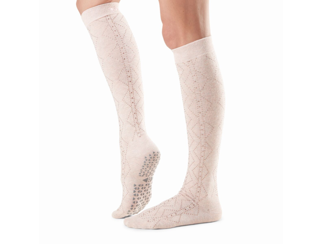 Jane bounds from studio to street with easy style that's soft and simple. Her knee high length keep legs warm, sexy and ready to perform while Tavi's stellar grip sock pattern safely moves you through your barre, Pilates, and yoga classes. Express the heart of Tavi with Function that Flows into Fashion.