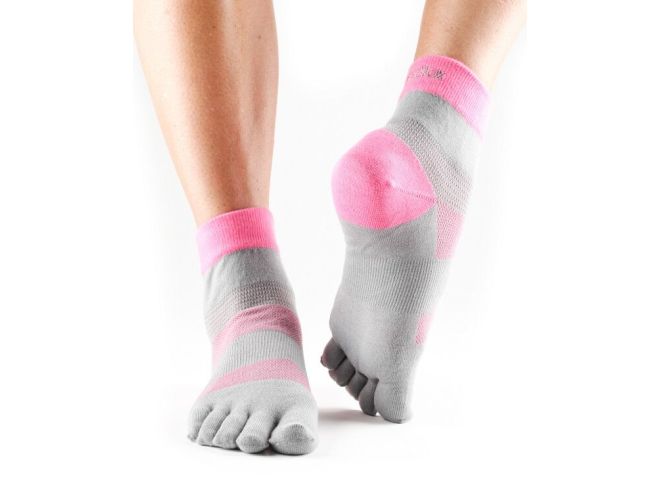 ANKLE RUNNING SOCK Tough is the new pretty. These ankle all sport socks are designed to support your feet and wick away sweat while you work on your pace. Secure dual welt band to keep debris out Vector heel creates defined heel cup for optimal fit Vented knit top allows for faster cooling and moisture release Arch band provides gentle pressure to lift and support Seamless five toe construction promotes circulation, removes moisture, eliminates friction and blisters between toes Unisex sizing 90% Polyester; 10% Spandex. Machine washable. Wash in gentle cycle. Line dry. Do not bleach or iron.